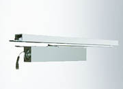 此闭门器可安装在门扇的合页异侧,具有电子机械停门功能。因此可安装在单扇防火门上。
