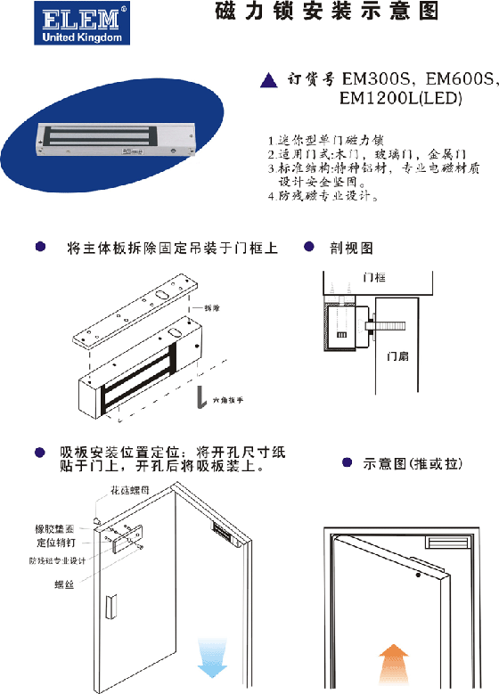 苏州多玛自动门,天津盖泽,深圳必盛,广州瑞可达,南京史丹利,苏州纳博克,杭州格屋,北京(Panasonic)松下自动门,上海自动门,杭州HID,成都西门子,重庆门禁,武汉感应门,西安旋转门,宁波GMT,无锡地弹簧,常州闭门器 当前位置:首页> 产品中心 > 一卡通系统 > 门禁配件 > ELEM EM600S标准型单门磁力锁